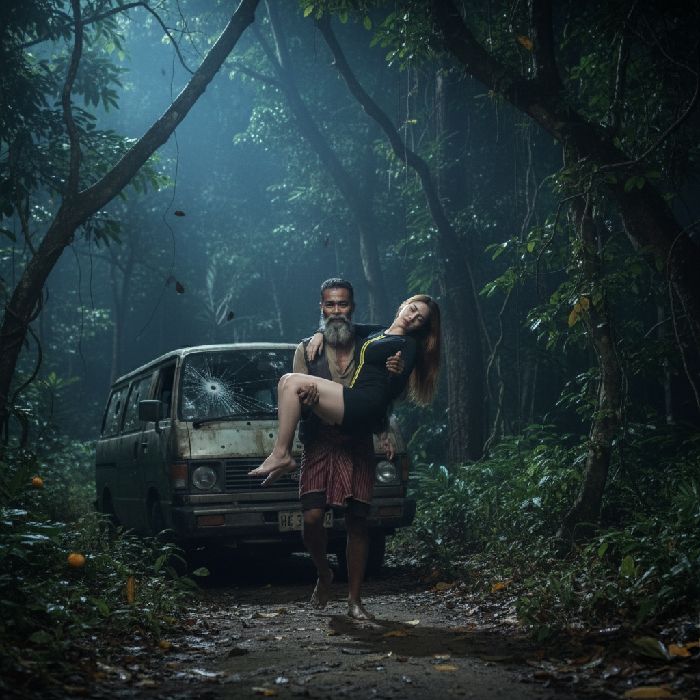 ผู้ชพู่ถืปืลจารถ แล้ิ่ไล่ตาไป่าระชั้ชิ เื่ผ่าห้าต่าหลัรถที่แต เธเห็ชาคหึ่าเลืู่เาะหลั ส่ีสาคำลัรีไต่ขึ้เิเขาเล็ๆ ข้าทา ผู้ชพู่ตะโเสีั “หุะ! ไ่ั้ฉัิ!”