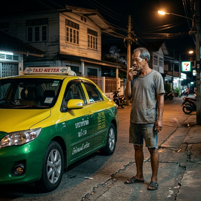 ไ้ผุเิำตุลาที่ห้ารถแท็ซี่ ห่าาพที่เ็ั่จะไ่ิ เขาคัุหรี่ขึ้าจุสู้ืที่สั่เทาเหืคเป็สัิาต