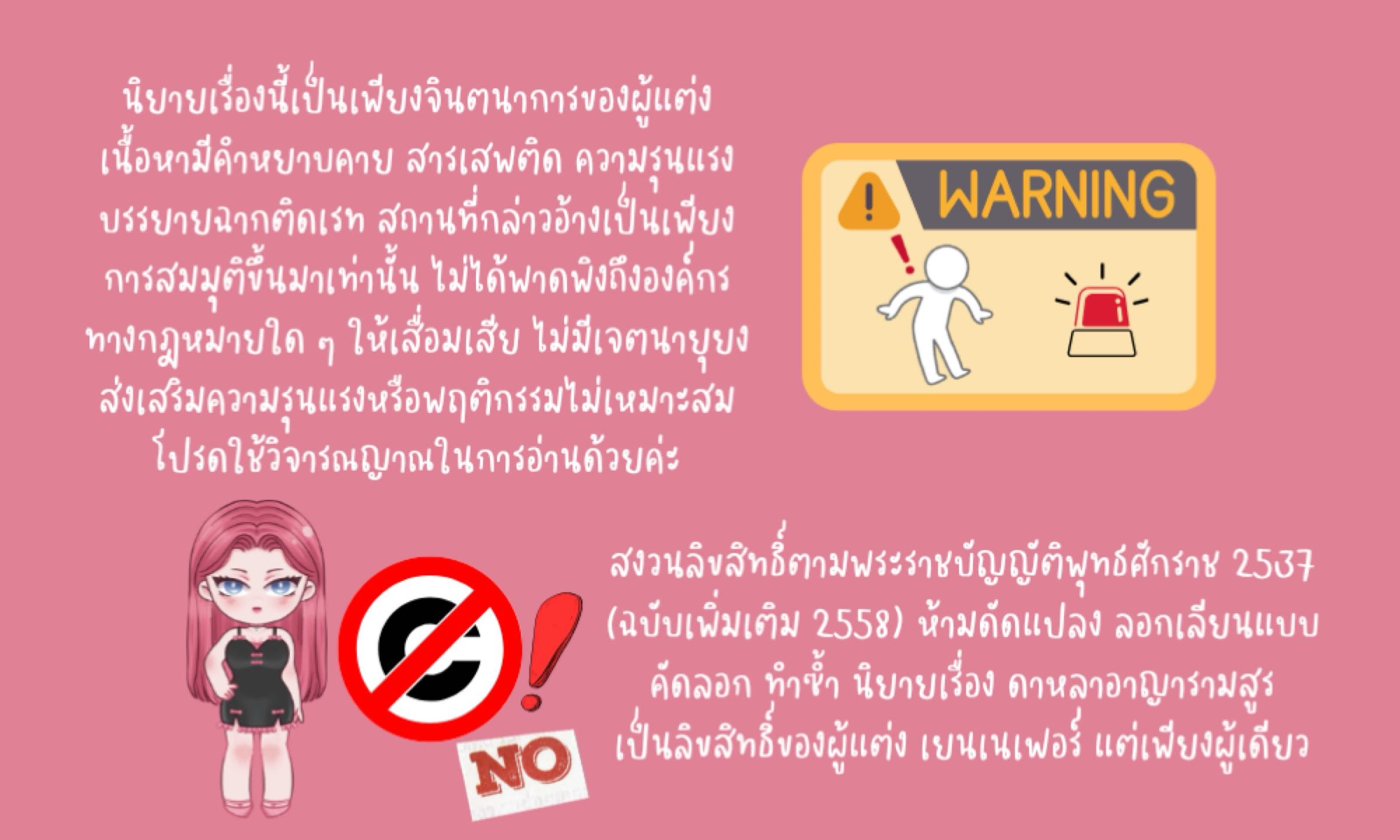 นิยายเรื่องนี้เป็นแนวอีโรติก-ดรามา มีช่วงตอนบีบคั้นหัวใจคนอ่าน รวมถึงตัวละครไม่ได้ขาวสะอาดตามทำนองครองธรรม ขอให้คุณนักอ่านคอมเมนต์กันอย่างน่ารักนะคะ